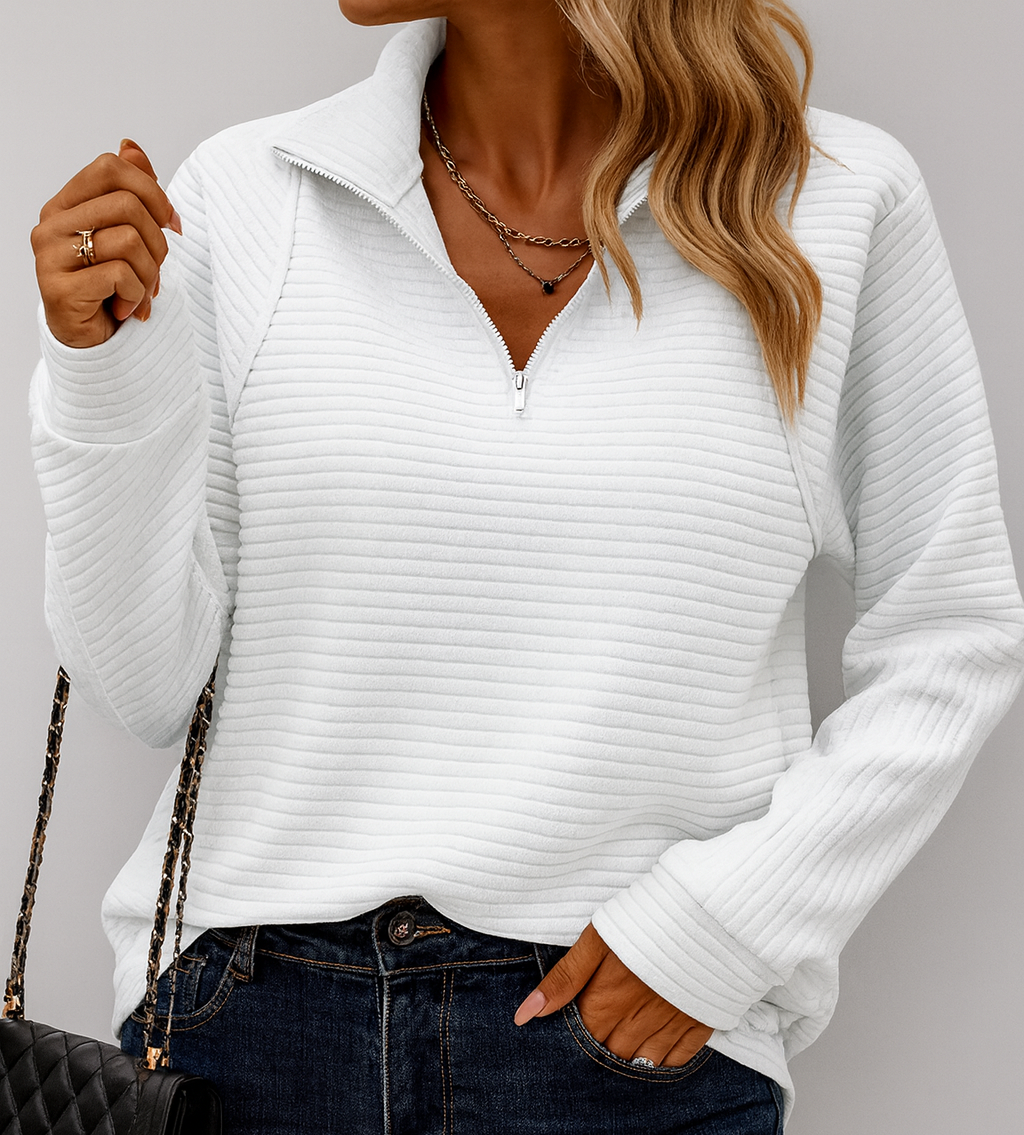 Le col zippé ajoute une touche chic et pratique, permettant d’adapter facilement ton look selon l’occasion : ouvert pour un style décontracté, fermé pour une allure plus soignée. Sa coupe légèrement ample assure une liberté de mouvement idéale tout en gardant une silhouette harmonieuse et tendance.